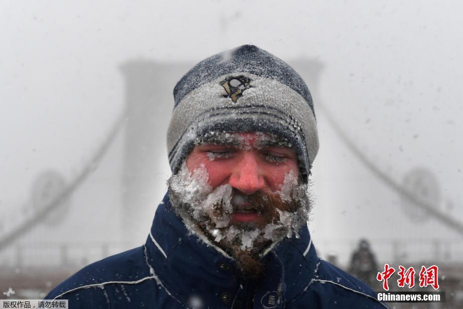 "炸弹气旋"为纽约带来暴雪 行人满脸冰碴