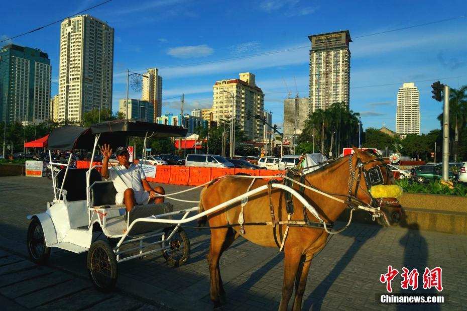 菲律宾首都马尼拉著名的罗哈斯大道,一侧是菲律宾诸多重要政府部门,一侧是市民们自由自在休闲的公共场所马尼拉湾大堤。马尼拉湾夕阳被誉为世界上最美夕阳之一,图为1月4日堤岸上的马车夫。中新社记者 关向东 摄