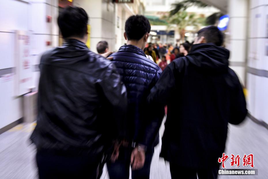 1月5日,大队长刘绍伟(右一)将犯罪嫌疑人郭某带往火车站派出所作进一步调查。 陈骥旻 摄