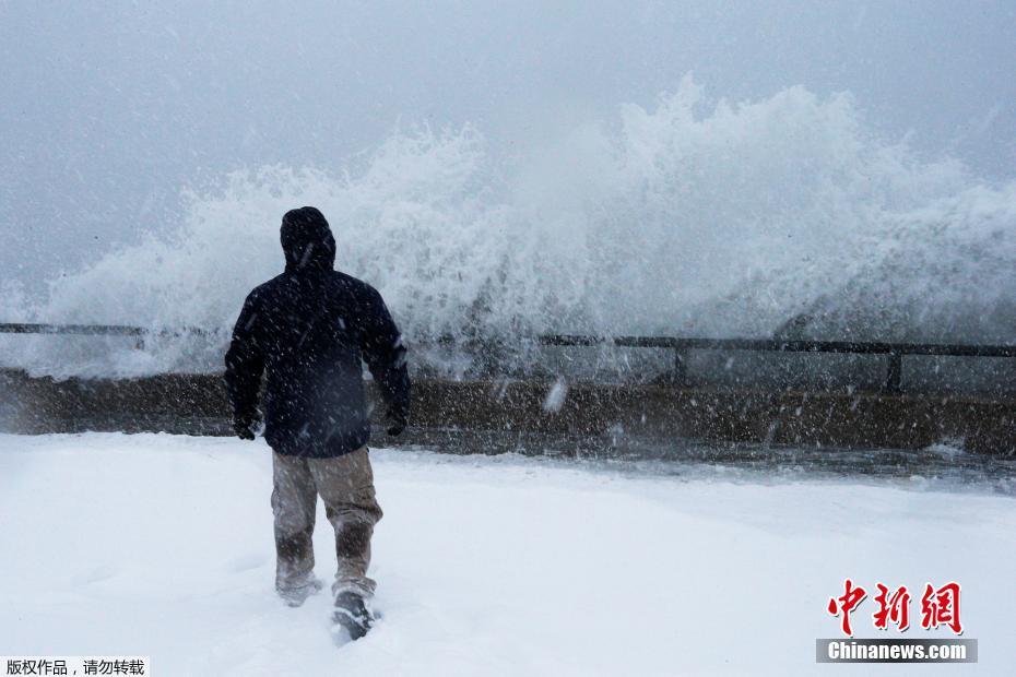 波士顿郊区市民站在海堤边观看波涛奔涌上岸。