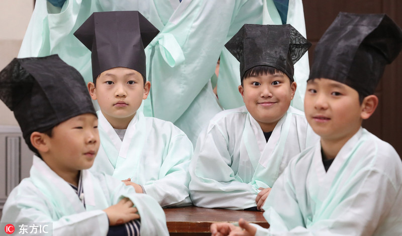当地时间2018年1月5日,韩国论山市,儿童身穿儒生服,参加假期礼节体验班。
