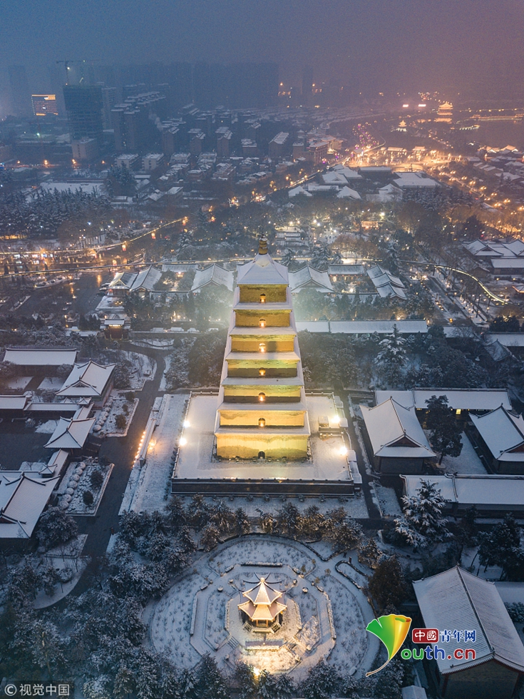 2018年1月6日晚6点西安,航拍雪后的大雁塔夜景,宁静而又有历史的厚重感。图片作者:一佳one/视觉中国