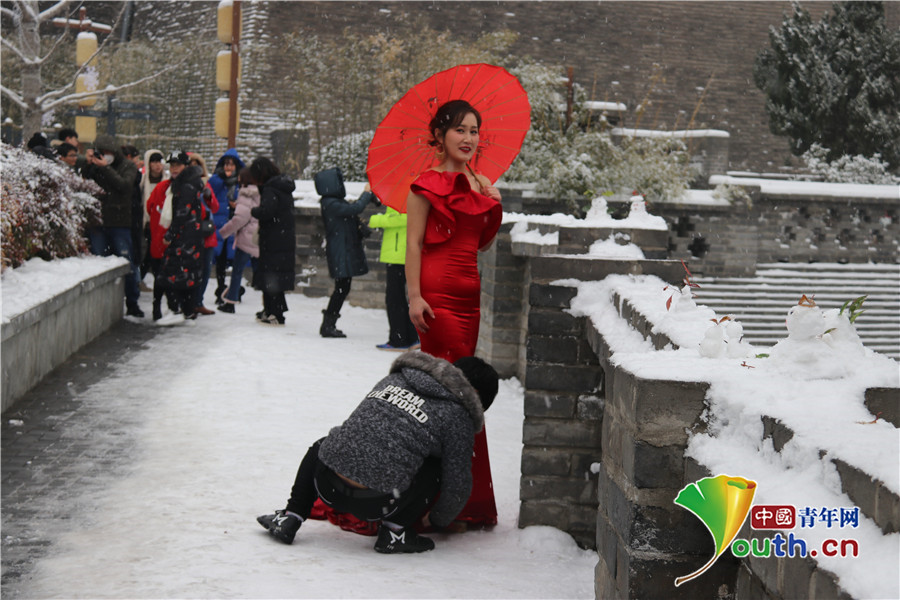 美丽“冻人” 西安多对新人大雪纷飞中拍婚纱照