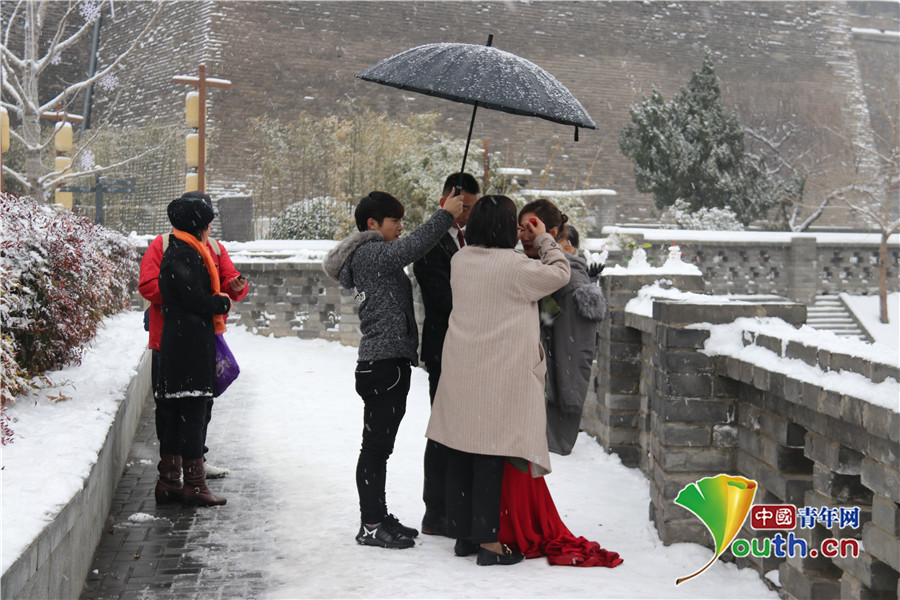 在西安南门城墙跟附近,一对穿着单薄礼服的新人面对镜头露出了幸福的笑容,当摄影师打出满意的手势后,新娘禁不住恢复了瑟瑟发抖的状态。迎着路人赞叹的目光,新娘说:“之前就想过在雪中拍婚纱照,正好遇上了,算是一种幸运吧,所以冻死也要拍。”