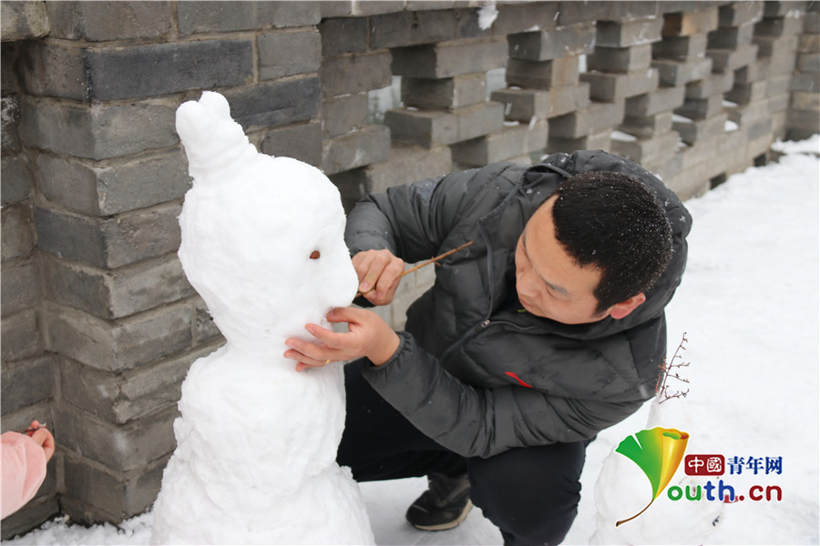 在众多雪人中,一个标记着“兵马俑”的雪人军团引人赞叹。“为了逗她开心嘛!”望着在一旁当小帮手的女儿,创作者介绍说,为了堆成这些雪人,他已经花费了近5小时。