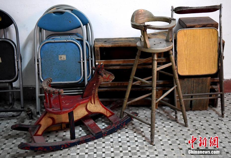 照相馆内老式的儿童椅子和木马车。 张斌 摄