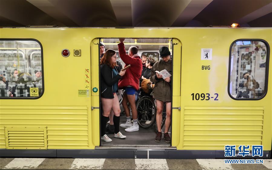 1月7日,在德国首都柏林,“不穿裤子搭地铁”活动的参与者乘坐地铁。当日,德国柏林举行“不穿裤子搭地铁”活动。该活动2002年始于美国纽约,目前这项行为艺术已经演变为世界多个城市的年度活动。新华社记者 单宇琦 摄