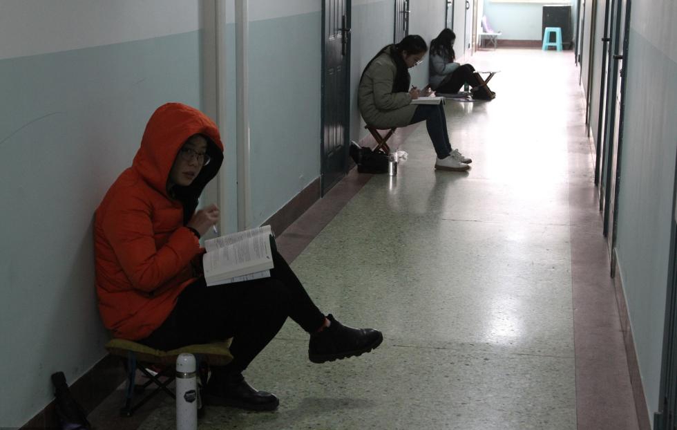 天寒地冻的天气不少大学生在楼道里苦读。