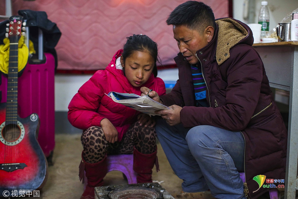 2017年12月30日,四川凉山,曲比史古老师在辅导大女儿阿牛的作业,因为长期不能回家,曲比老师把大女儿也带到瓦吾教学点来上学,另外两个儿子跟随妈妈在家中上学。图片作者:视觉中国