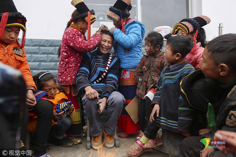 2017年12月31日,四川凉山,在课间两名孩子在给曲比史古老师拔白头发,孩子们都把曲比史古看做自己的亲人。图片作者:视觉中国