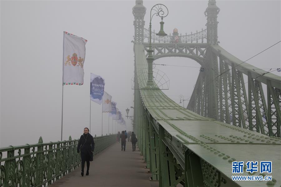 1月7日,在匈牙利首都布达佩斯,行人在大雾笼罩的自由桥上行走。 新华社发(弗尔季·奥蒂洛 摄)