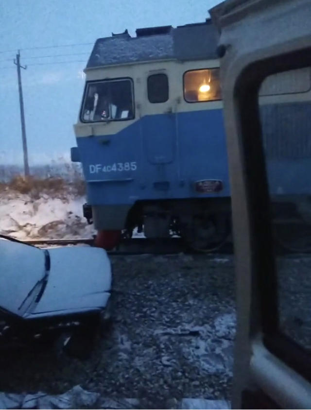 哈尔滨一铁路道口火车与轿车剐碰 致2死3伤