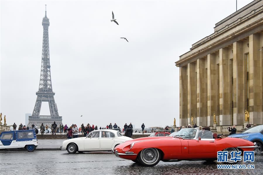 1月7日,一辆插着法国国旗的古董越野车驶过法国巴黎特罗卡德罗广场。当日,各式跑车、越野车、摩托车、自行车等老式车辆参加第18届老爷车冬季巴黎巡游活动。 新华社记者陈益宸摄