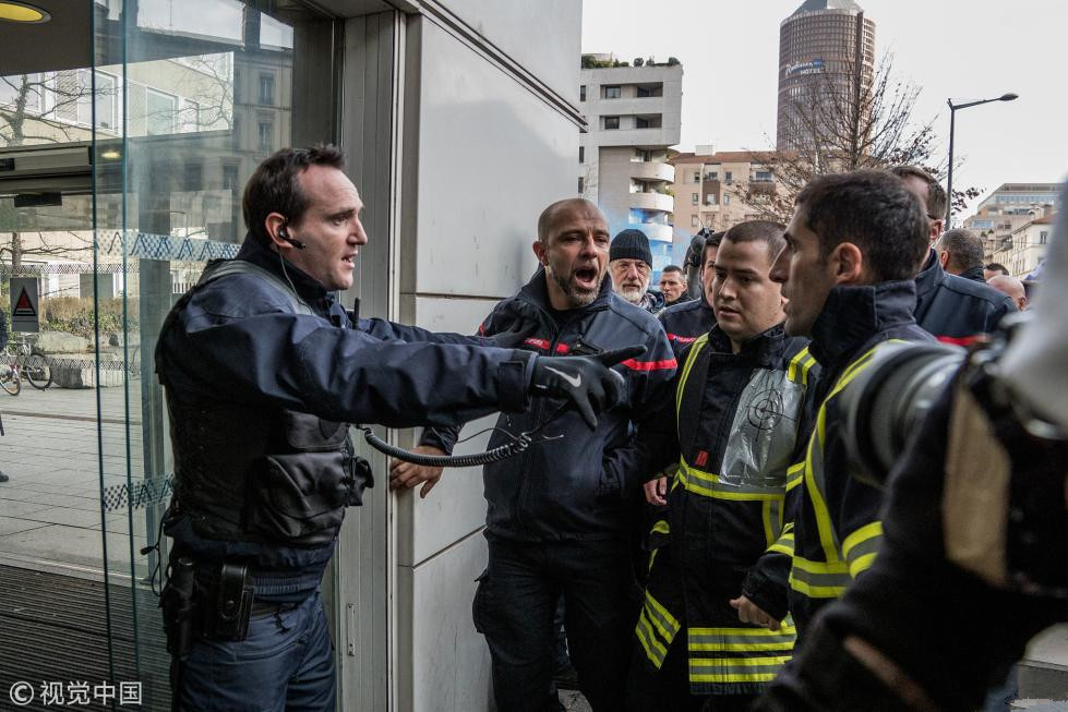 当地时间2018年1月8日,法国里昂,消防员举行“抬棺材”示威,抗议成为暴力冲突受害者。
