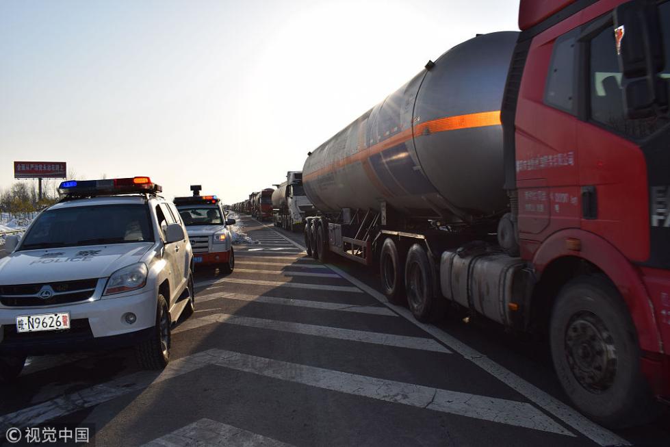 1月8日下午3时许,道路结冰全部清除完毕,满足通行条件,交警和六武路政、金寨高速公路管理公司三部门到达长岭关服务区,而此时滞留的危化品车辆已达150余台。交警提前在服务区内向危化品车辆驾驶员讲明“压速带道”的方案,要求各危化品车辆依次排队跟随警车通行。