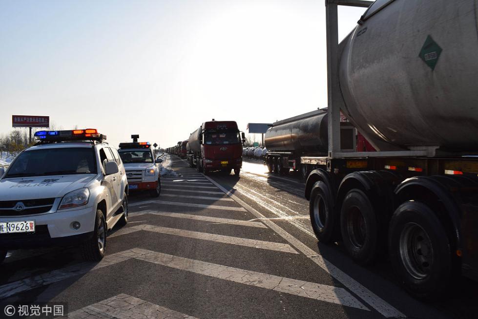 根据处置方案,警方驾驶人警车负责在前方压速带道,路政和管理公司负责在后方护尾,同时临时关闭各收费站入口,防止其他车辆汇入造成危险。150余台危化品车辆,在高速公路上依次排队通行,绵延近八公里,前方带道的民警积极和后方护尾人员电话沟通联系,保持匀速,确保车队安全通行。16时20分许,六安高速交警二大队与友邻大队在大顾店枢纽进行对接,成功将滞留的150余台危化品车辆全部安全带出辖区,及时消除了安全隐患。
