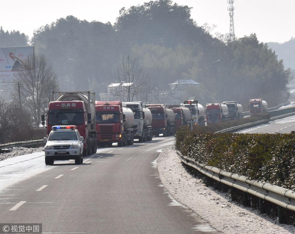 据新农村商报报道,2018年1月9日消息,安徽六安。因道路积雪结冰而进行车辆限行管控,150余台危化品运输车辆滞留在六武高速服务区内。1月8日下午,安徽省六安市公安局交警支队高速公路二大队联合六武路政、金寨高速公路管理公司,采取警车压速带道的方式,成功将滞留的危化品车辆安全转移。供图:刘容海/视觉中国