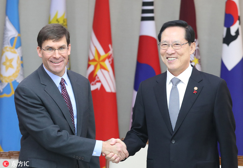 当地时间2018年1月10日,韩国首尔,韩国国防部长官宋永武会见美军陆军长官Mark Esper,并与随行的驻韩美军司令官Vincent Brooks举行了会谈。