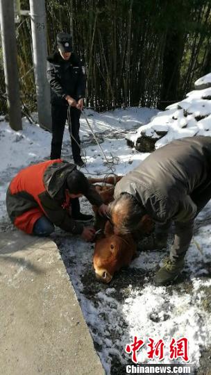 当天上午9时,虎牙藏族乡派出所的警察来到村民谢登发家,对他家的老黄牛抽取血样;随后,警察又来到村民额么甲家,对他家的老黄牛抽血取样。待血样采集完成后,将送往昆明的鉴定中心进行鉴定,通过DNA亲子鉴定为这只小黄牛找到亲生妈妈。图为抽血现场。