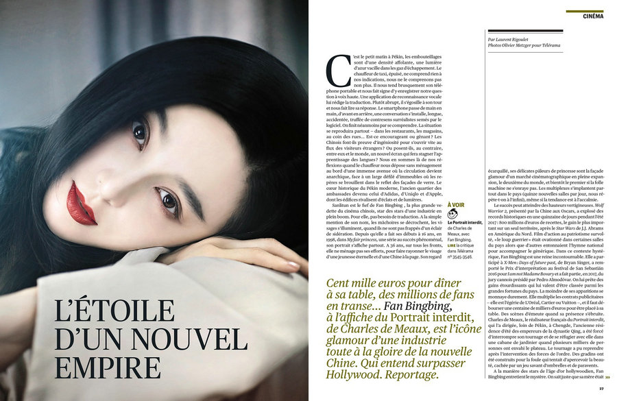 法国《Télérama》有70年的历史,作为电视与电影类的权威杂志,玛丽莲·梦露、朱利安·摩尔、莱昂纳多·迪卡普里奥、马里昂·歌迪亚等巨星都曾坐镇《Télérama》封面,这也是亚洲明星在时隔多年后再次登封。照片中,镜子映射出范冰冰精致的脸庞,眉眼清澈,红唇夺目,光彩熠熠,尽显东方神韵。