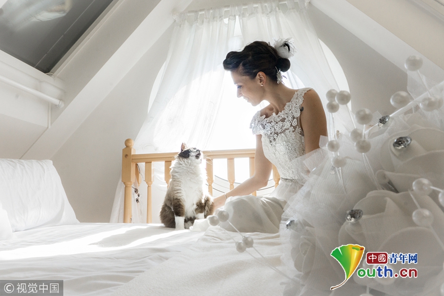 Marianna是个不折不扣的猫奴,她自己结婚时就没能让喵主子Arthur参加婚礼,为此耿耿于怀。为了填补这个遗憾,Marianna突发奇想,与Arthur拍摄了一组婚纱照。
