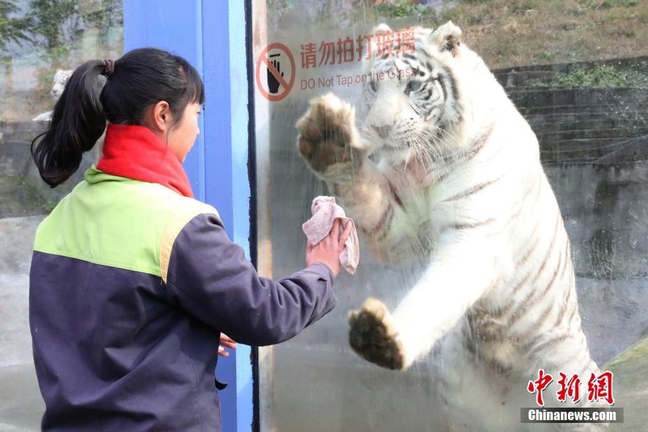 重庆一动物园“劳模”白虎 模仿饲养员“擦玻璃”
