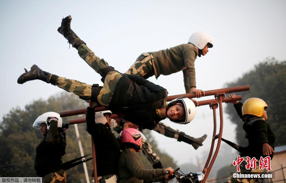 当地时间1月10日,印度边境安全部队女成员在新德里参加“共和日”阅兵彩排,苦练“摩托车特技”。