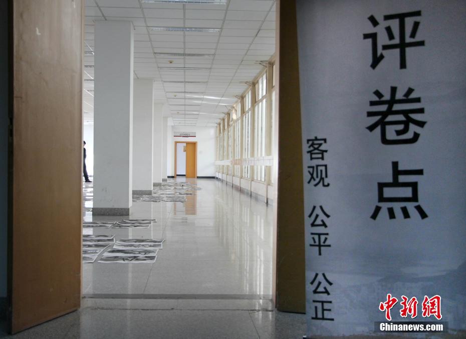山东美术统考阅卷现场 老师手持长杆“画海”选优