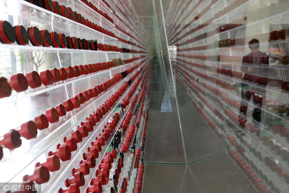 ​2018年1月10日,在河北省邯郸市行政审批局内建成了一个公章封存展示墙,公章封存展示墙内展示着2660余枚公章吸引前来办事的市民。供图:郝群英/视觉中国