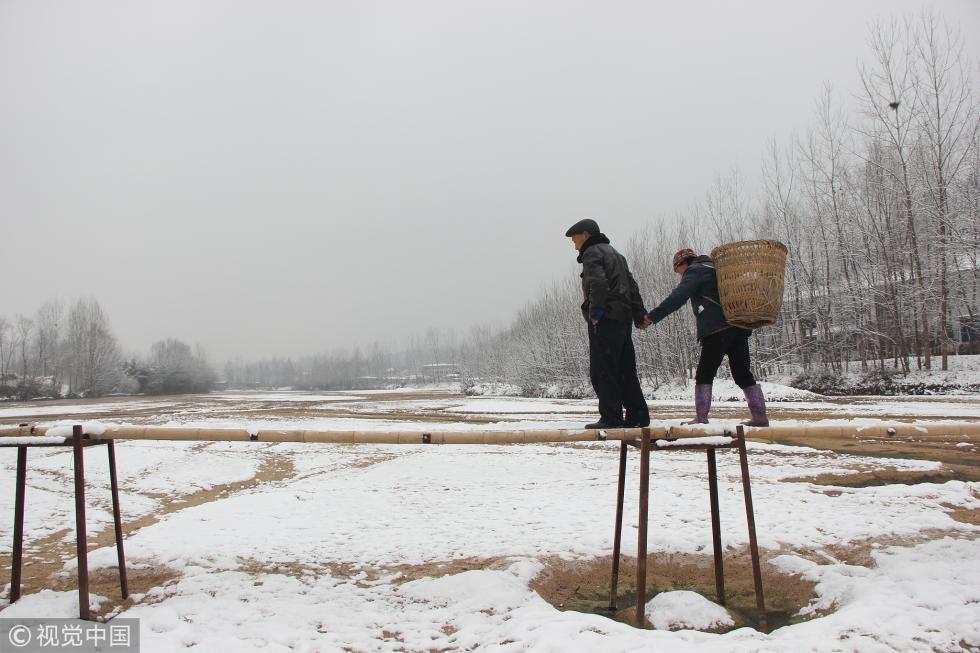 2018年1月5日,陕西汉中,下雪天,竹桥上结满冰碴子,村民和孩子们走在上面比较危险。
