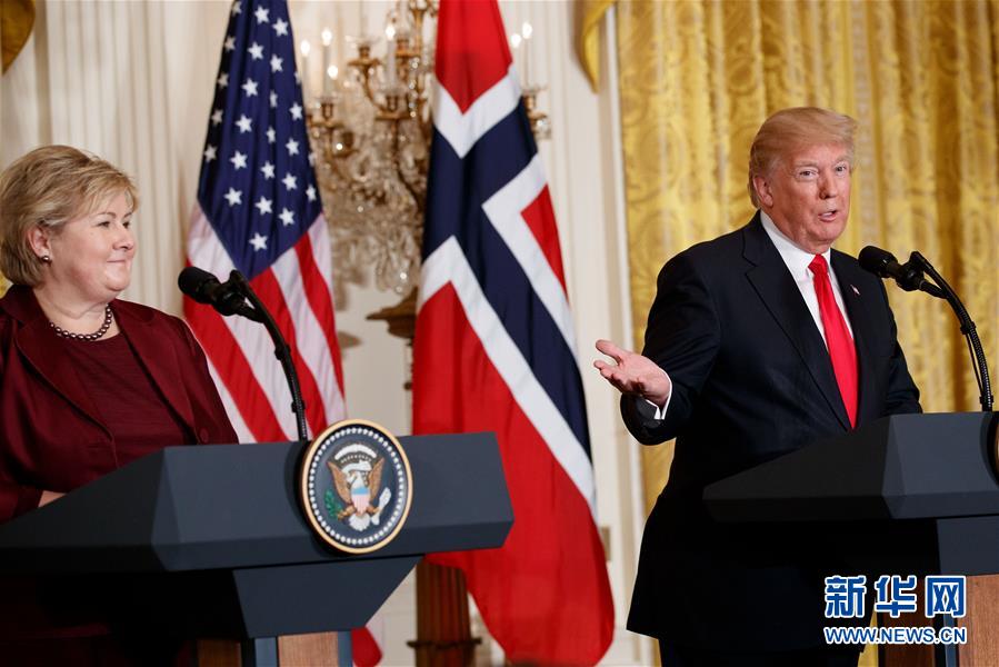 1月10日,在美国华盛顿白宫,美国总统特朗普(右)和挪威首相索尔贝格举行联合记者会。美国总统特朗普10日在与挪威首相索尔贝格共同主持的白宫记者会上说,美国有可能重返全球应对气候变化的《巴黎协定》,但前提条件是必须按美国意愿重新达成“公平”的协议。新华社发(沈霆摄)