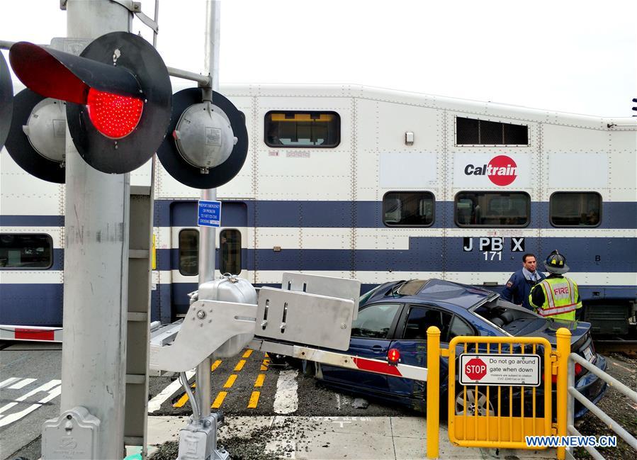The site where a Caltrain hit a car is seen at Broadway intersection in Burlingame, San Francisco, the United States, Jan. 10, 2018. A Caltrain hit a car at Broadway intersection in Burlingame and caused delays to the service. (Xinhua/Wu Xiaoling)
