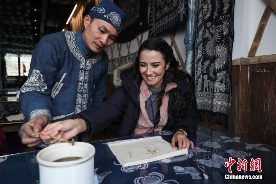 1月11日,一名女留学生在蜡染技艺传承人的指导下作画。当日,北京大学燕京学堂留学生代表团一行到贵州丹寨体验苗族蜡染、古法造纸等国家级非物质文化遗产技艺。中新社记者 贺俊怡 摄