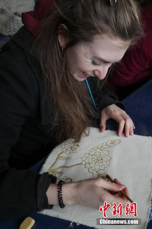 1月11日,一名女留学生即将完成她的第一幅蜡染作品。当日,北京大学燕京学堂留学生代表团一行到贵州丹寨体验苗族蜡染、古法造纸等国家级非物质文化遗产技艺,感受贵州苗族传统文化。中新社记者 贺俊怡 摄