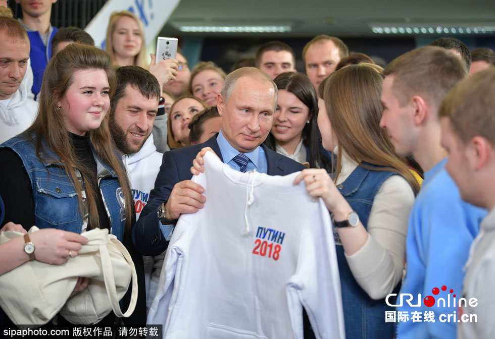 当地时间2018年1月10日,俄罗斯莫斯科,俄罗斯总统普京访问竞选办公室。图片来源:SIPAPHOTO