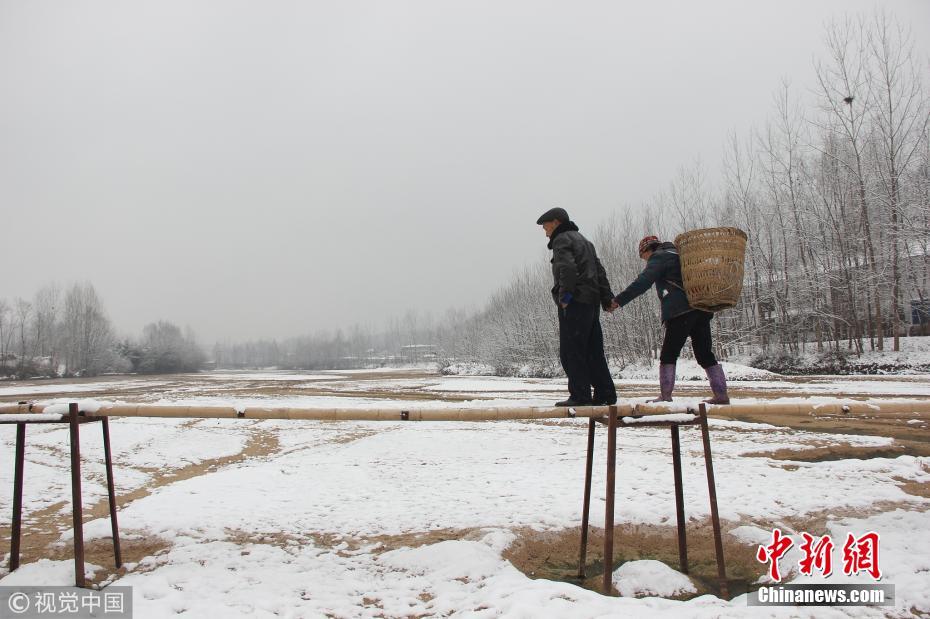 陕西城固县两村庄67名学生靠简易竹桥通行上学,雪后桥面结冰,危险难行,当地民众盼望建一座“安全桥”。城固县交通运输局工作人员1月11日表示,目前建桥地址已确定,正在组织招投标。图为1月5日,陕西汉中,下雪天,竹桥上结满冰碴子,村民和孩子们走在上面比较危险。张映伟 周金柱 摄 图片来源:视觉中国