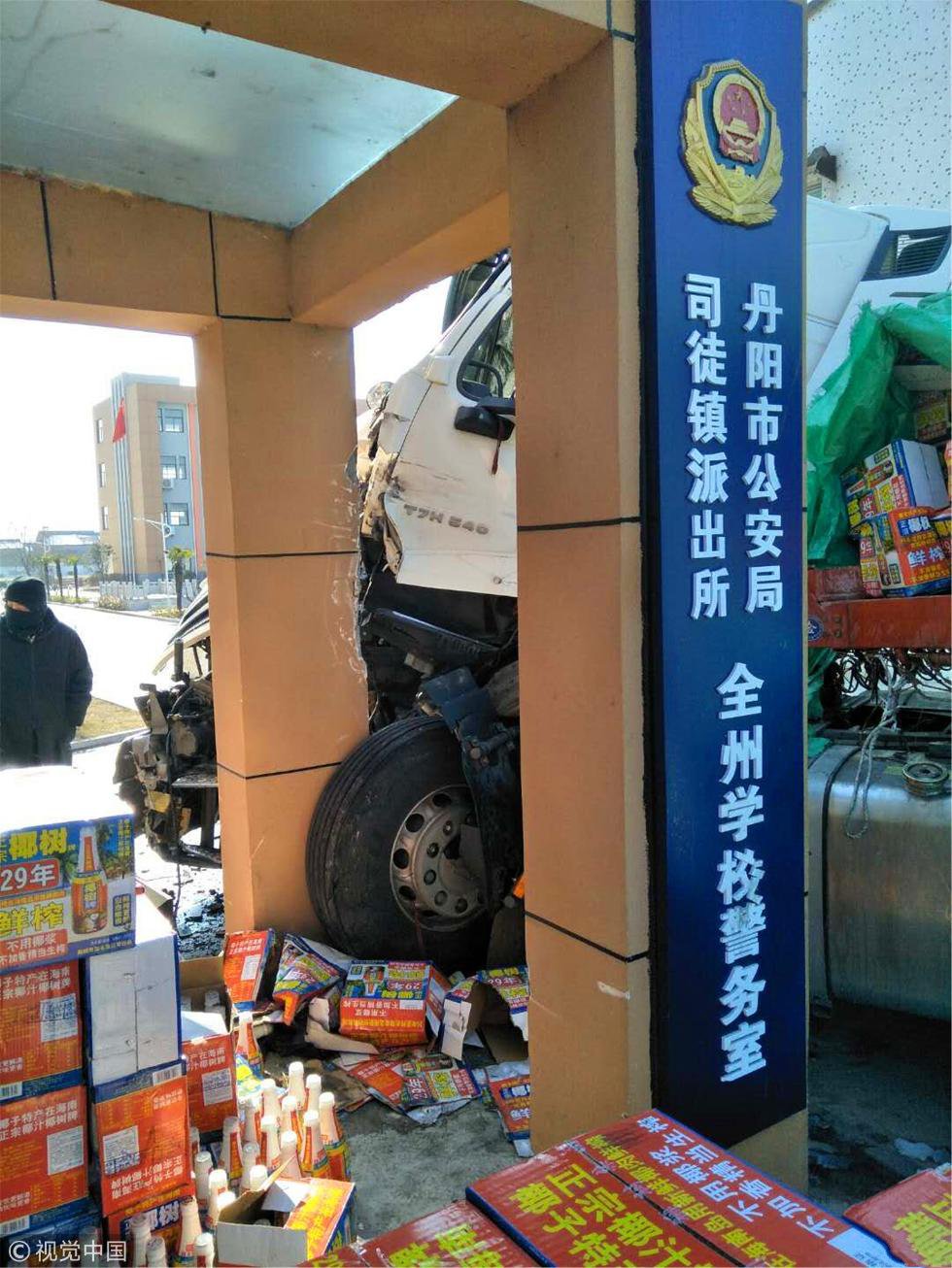 2018年1月11日,江苏镇江,一辆大货车和一辆危化品车发生相撞。此后,大货车因失控,直接冲入丹阳全州学校大门内。来源:视觉中国