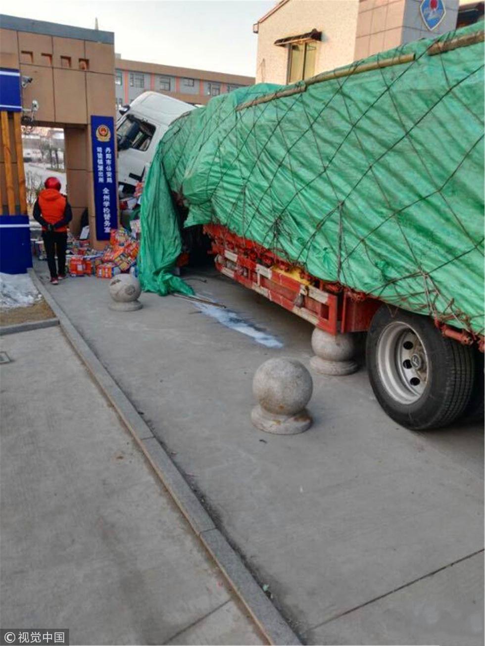 2018年1月11日,江苏镇江,一辆大货车和一辆危化品车发生相撞。此后,大货车因失控,直接冲入丹阳全州学校大门内。来源:视觉中国