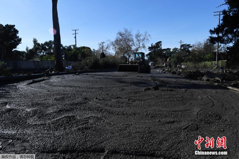泥石流还冲垮了101高速公路圣塔芭芭拉至文图拉约48公里路段,当局发布了居民疏散通知,并关闭了附近5条高速公路。图为蒙特西托地区的一条公路上积满了泥巴,推土机正在清理这条道路。