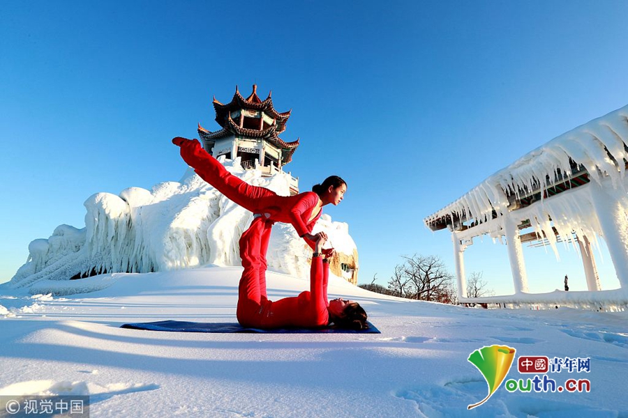 ​2018年1月11日,河南洛阳,栾川伏牛山滑雪场,几名小姐姐们在雪地上身穿红色的瑜伽服,不畏三九寒天在山顶的冰天雪地里修炼瑜伽,时而“金鸡独立”,时而雪地一字马,犹如红梅傲雪绽放。