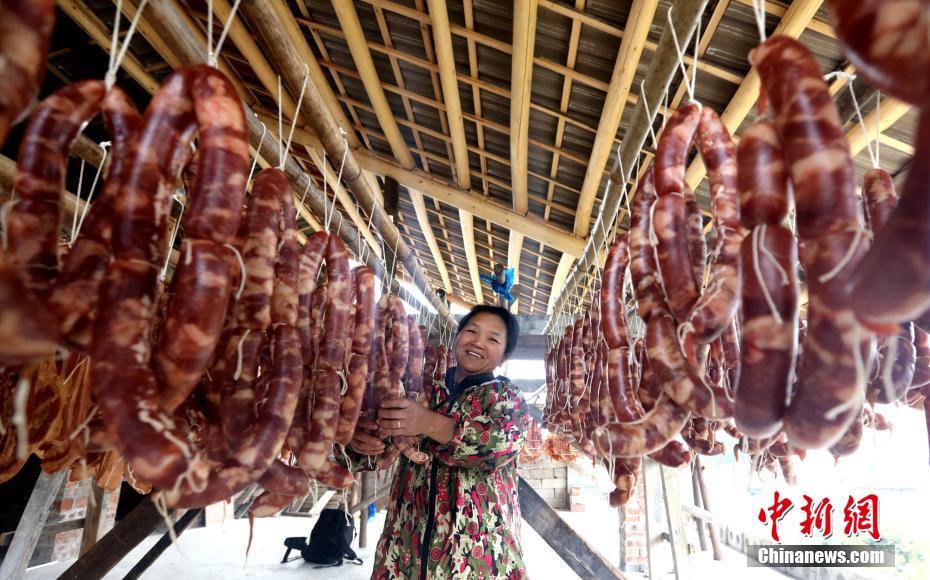 三江村民王水兰在整理制作好的腊肠,小区里处处腊味飘香。吴练勋 摄