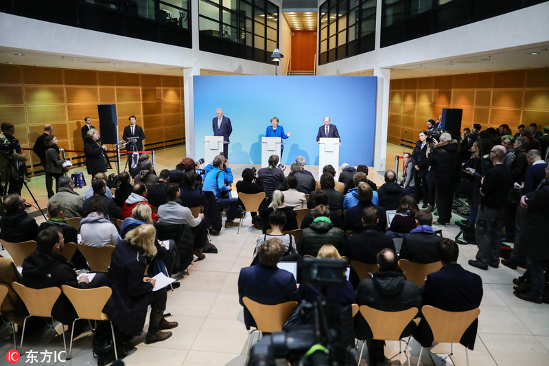 当地时间2018年1月12日,德国柏林,德国总理兼基督教民主联盟默克尔、基督教社会联盟主席霍斯特-泽霍费尔(Horst Seehofer)同社会民主党主席马丁-舒尔茨(Martin Schulz)共同召开新闻发布会。
