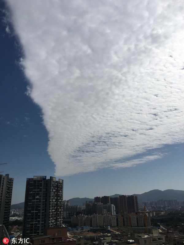 中午12点的时候,深圳上空更是美丽壮观,一条白云如同一条白洁的毛巾,连接天空东西两端,一端接着深圳凤凰山,一端接着珠江,似乎将蓝天分成两半,一南一北,登高楼顶,放眼千里,浩瀚无际,可谓之“拱门云”,着实美丽壮观。