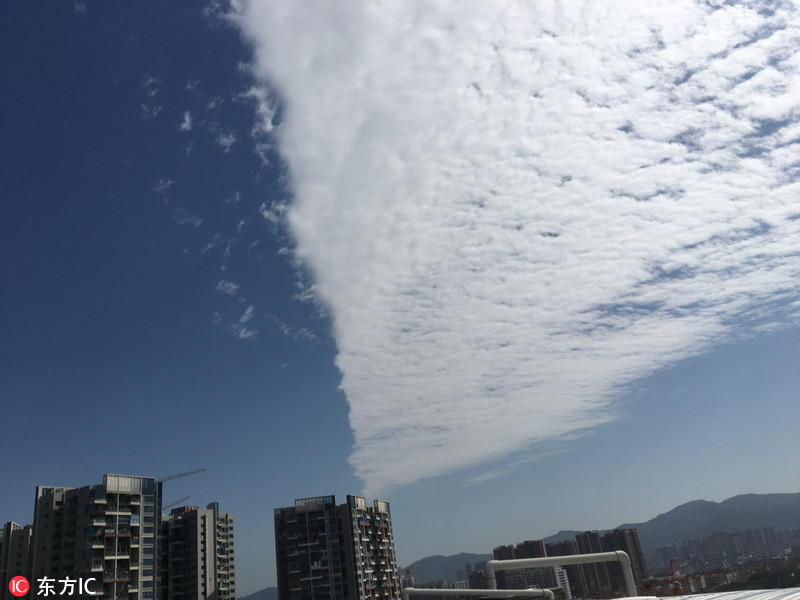 中午12点的时候,深圳上空更是美丽壮观,一条白云如同一条白洁的毛巾,连接天空东西两端,一端接着深圳凤凰山,一端接着珠江,似乎将蓝天分成两半,一南一北,登高楼顶,放眼千里,浩瀚无际,可谓之“拱门云”,着实美丽壮观。