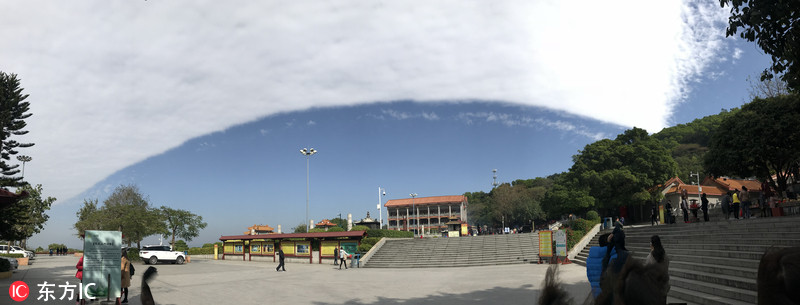 中午12点的时候,深圳上空更是美丽壮观,一条白云如同一条白洁的毛巾,连接天空东西两端,一端接着深圳凤凰山,一端接着珠江,似乎将蓝天分成两半,一南一北,登高楼顶,放眼千里,浩瀚无际,可谓之“拱门云”,着实美丽壮观。
