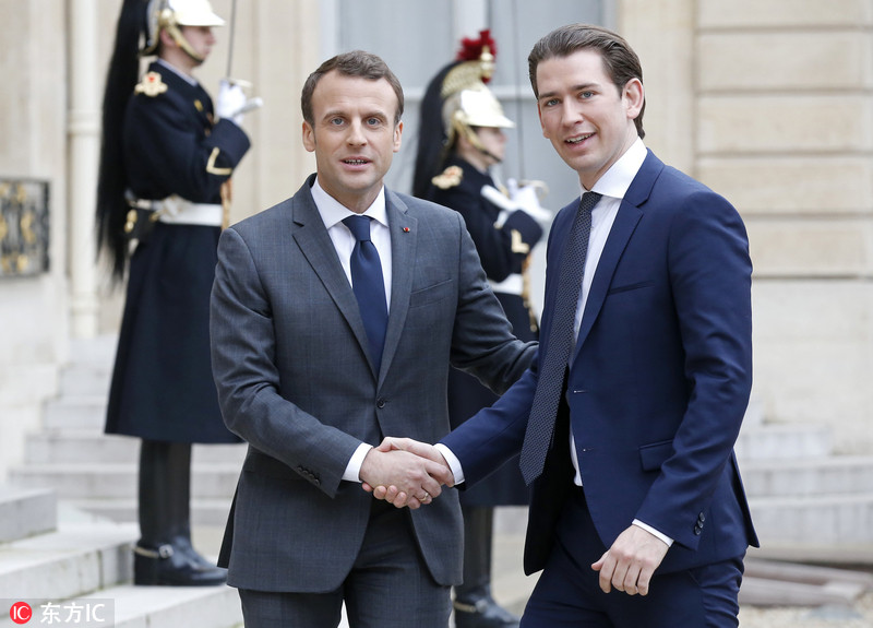 法国总统马克龙会见奥地利总理库尔茨。