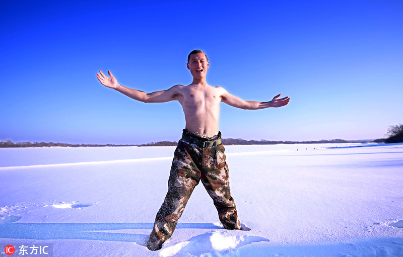 2018年1月5日,天寒地冻好练兵!时下,正值数九寒冬的东北边陲乌苏里江边气温已降至零下30℃。黑龙江边防总队虎林边防大队虎头机动中队组织官兵开展为期一周的耐寒训练。训练中,官兵们在积雪中进行了倒功、用雪搓身、雪地摔跤等科目训练,提高了官兵对寒冷环境的耐寒能力,锻炼了强健体魄,培育了战斗精神,砥砺血性虎气,进而检验和提升官兵在极寒天气下的遂行多样化任务能力。李昊燃/东方IC