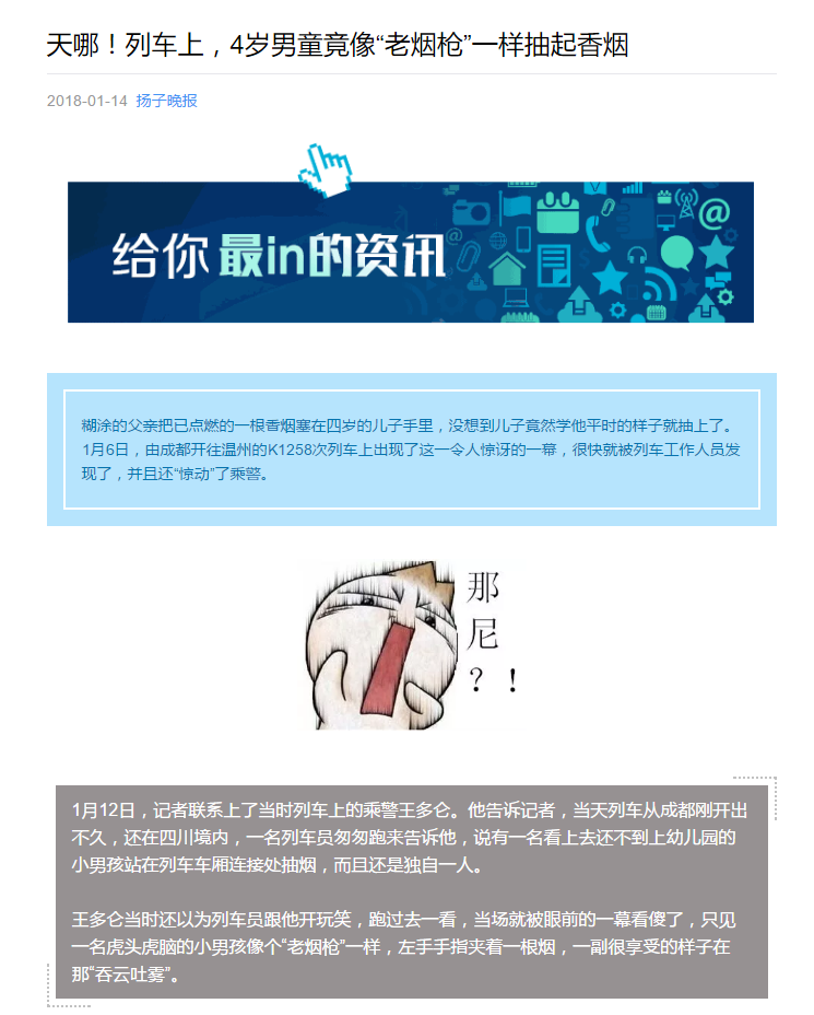 4岁男童列车上“熟练”抽烟 惊动乘警