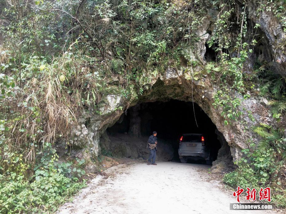 在贵州省长顺县代化镇睦化社区斗篷村摆拱组的通组路上,有一段修建在天然溶洞中的通组路。该路段道路宽约5米,全长540米,顶部是奇形怪状的钟乳石,洞内有十余个急转弯,最窄处仅够一辆越野车缓慢通过,车辆行驶其中,颇为惊险。 中新社记者 杨云 摄