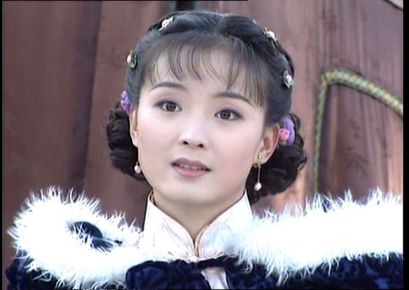 万秋玲,浅杏色衣裙+黑色兔毛斗篷